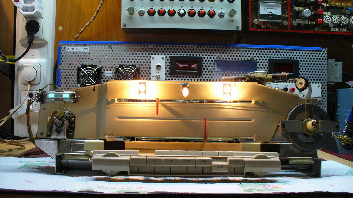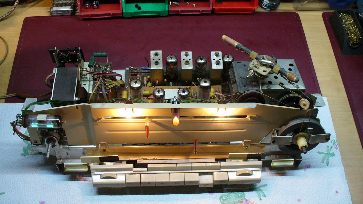 Zur Revidierung; Das übliche, Staub, altes festgebackenes Harz, defekte Birnen , der Selen Brückengleichrichter als defekt ausgetauscht, (original ungebraucht) , der Becherelko 2 x 100 µF/385 V, Ratiodedektor Elko 5 µf durch 4,7µ/35 V ersetzt. Ein Widerstand 82 K in der zweiten ZF Stufe EF 89 g2, war tot, Sicherungshalter leicht oxidiert, gereinigt.