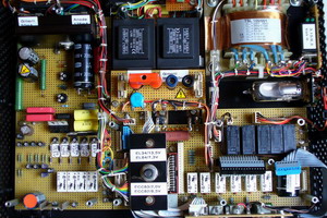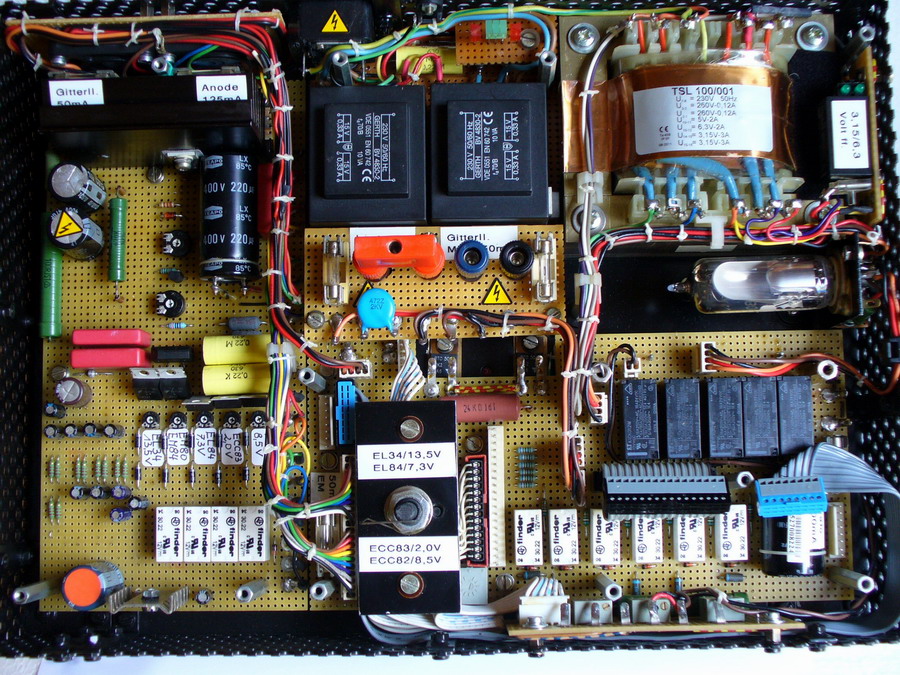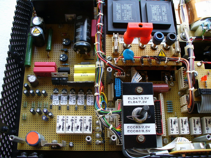 Bis auf drei Drähte, die abgelötet werden, kann das komplette Röhrenprüfgerät zerlegt werden. Das ist im Falle einer Reparatur notwendig. Durch die Modulbauweise kann eine ordentliche Reparatur sichergestellt werden. Wodurch diese erleichtert wird bzw. ein Zusammenbau, ohne das sich Fehler einschleichen erleichtert wird. Durch die Anwendung der Raster Leiterplatten, konnte ich alles unterbringen, wieder beiseite räumen und neu anfangen. Am Ende war der Platz mit allen Bauteilen belegt. Professionelle Leiterplatten Herstellung ist aufwendig und in diesem Fall ungeeignet, aus Platzgründen. Beim Löten auf diesen Rasterleiterplatten, muss unbedingt darauf geachtet werden, dass sich keinerlei Kurzschlüsse einschleichen. Eine ruhige Hand und gute Augen sind da sehr hilfreich. Das gesamte Projekt arbeitet tadellos und zu meiner vollsten Zufriedenheit, schon eine längere Zeit. Somit wieder ein Projekt erfolgreich zu Ende gebracht und eine Röhrenprüfung leicht gemacht.