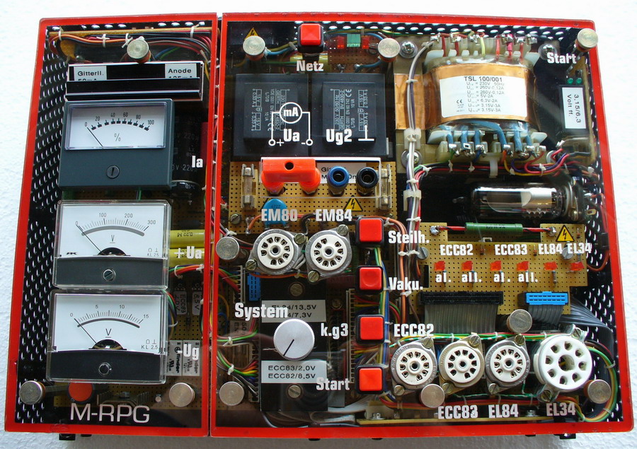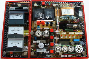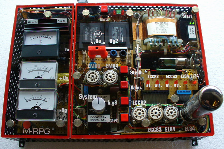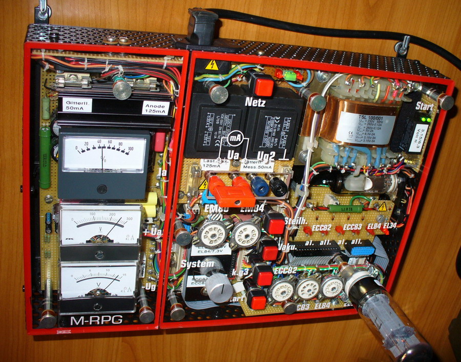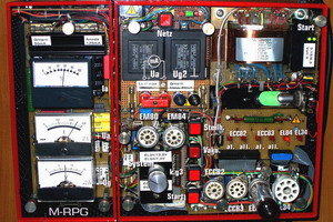 Mit dem "M-RPG" können Röhren wie EL 34, EL 84, die ECC 82, ECC83, EM 80 und EM 84 geprüft werden. Dies sind die Röhren, welche ich in meinen Vorgänger-Projekten eingesetzt habe. Der Grund zum Bau des Röhrenprüfgerätes war, dass etliche neue Röhren nach wenigen Betriebsstunden bis nahezu 50% ihre Leistung verloren hatten. Um die Funktion bei einer Wartung der Verstärker zu testen, hab ich mich entschlossen diesen Aufwand zu betreiben. Hatte auch schon länger vor, dieses Projekt zu realisieren. Im Aufbau der Schaltung habe ich mich an den Datenblättern dieser Röhren gehalten, die ausschließlich 250 Volt zum Messen benötigen. Auch die exakten Gittervorspannungen dieser Röhren lt. Daten-Blatt sind eingehalten. Nur so kann eine genaue, und ehrliche Leistungsermittlung erfolgen. Röhrenprüfgeräte die professionell aufgebaut sind, verfügen über mehr Messmöglichkeiten, bzw. können etliche Röhren mehr prüfen. Das war aber nicht mein Anliegen. Natürlich ist das hier vorgestellte Projekt nur ein "Abklatsch" der sonst industriell produzierten Geräte. Wie gesagt, seinen speziellen Ansprüchen soll es genügen, jedenfalls für meine Prüfzwecke. Meine entworfene Schaltung ist beliebig erweiterbar. Aus Platzgründen musste ich mich einschränken. Mein Anliegen war, dass so einfach wie möglich, eine Prüfung dieser Röhren machbar ist, auch für den Laien. System wählen, ein stöpseln und Messwerte ablesen, danach noch auf Knopfdruck verschiedene Funktionen testen - Fertig!