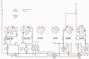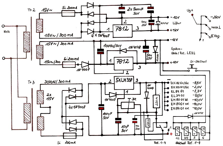 Es gibt diverse Netzteilschaltungen (Mosfet-Längsregelung), aber diese sind entweder zu instabil, schwingen im UKW Bereich, oder verhalten sich mit zu großer Verlust-Leistung am Transistor selbst, im Thermischen Grenzbereich. Anfangs wollte ich eine EZ 81 als Gleichrichtung, wegen des langsamen Hochfahrens der Anodenspannung einsetzen. Davon musste ich zum Schluss abkommen. Die EZ 81 macht ihre 150 mA, aber der Spannungsverlust ist enorm (20 Volt) und mehr. Bei 2 x 260 Volt/120 mA sackt diese regelrecht ab. Also musste ich eine Graetzbrücke anwenden. Diese hat einen Spannungsverlust unter 2 Volt. Es gibt Schaltungen, die 2 Netzteile im Längsbetrieb, für Anode bzw. Gitter 2 haben. Das ist aber nicht erforderlich, denn nach Daten zb. EL 84 /EL 34 müssen Anode und Gitter 2 die selbe Spannung von 250 Volt aufweisen. Wichtig war auch beim funktionieren des Netzteils, das beide Spannungen nicht unter 250 V absinken. Ein Netzteil genügt ! Das Gitter 2 kann mit einem Widerstand von 100 Ohm entkoppelt werden. Wie gesagt: wichtig ist, das Netzteil muss über 250 Volt (255 Volt bei 1 mA bzw. 100 mA/ 250 Volt) stabil bleiben. Was darunter ist, muss dann als Messwertfehler angesehen werden. Das konnte ich durch experimentelle Versuche feststellen. Also besser, den Spannungsregler etwas höher einstellen, (ca. 256 Volt.) Diese Spannung hat keinerlei Einfluss, auf den Strom der Röhren. Jedenfalls keinen erheblichen Einfluss derer. Was noch eventuell von Bedeutung ist, die Widerstände im Leistungs-Bereich, sollten 2 Watt nicht unterschreiten. Ein normaler Kühlkörper mit Rippen, soll es sein. Davor zwei kleine Lüfter, die dauerhaft den Kühlkörper belüften, (auch die 3 Z-Dioden/250 Volt) die können auch sehr heiß werden. Die nun frei gewordene Röhrenfassung, der EZ81 nimmt nun die EM80 ein. Diese nutze ich zur Gitter 2 Bereitschaft. Was das Netzteil für 250 Volt anbetrifft, so arbeitet dieses stabil, und hat sich nun schon einige Zeit bewährt. Im Prinzip ist diese Variante des Schaltungsaufbaus für diese Zwecke schon geeignet. Aber um eine genaue Stabilität zu erreichen, müssten schon andere Schaltungen her, richtig stabil bekommt man das so nicht hin. Differenzen von 5 Volt sind noch hinnehmbar.