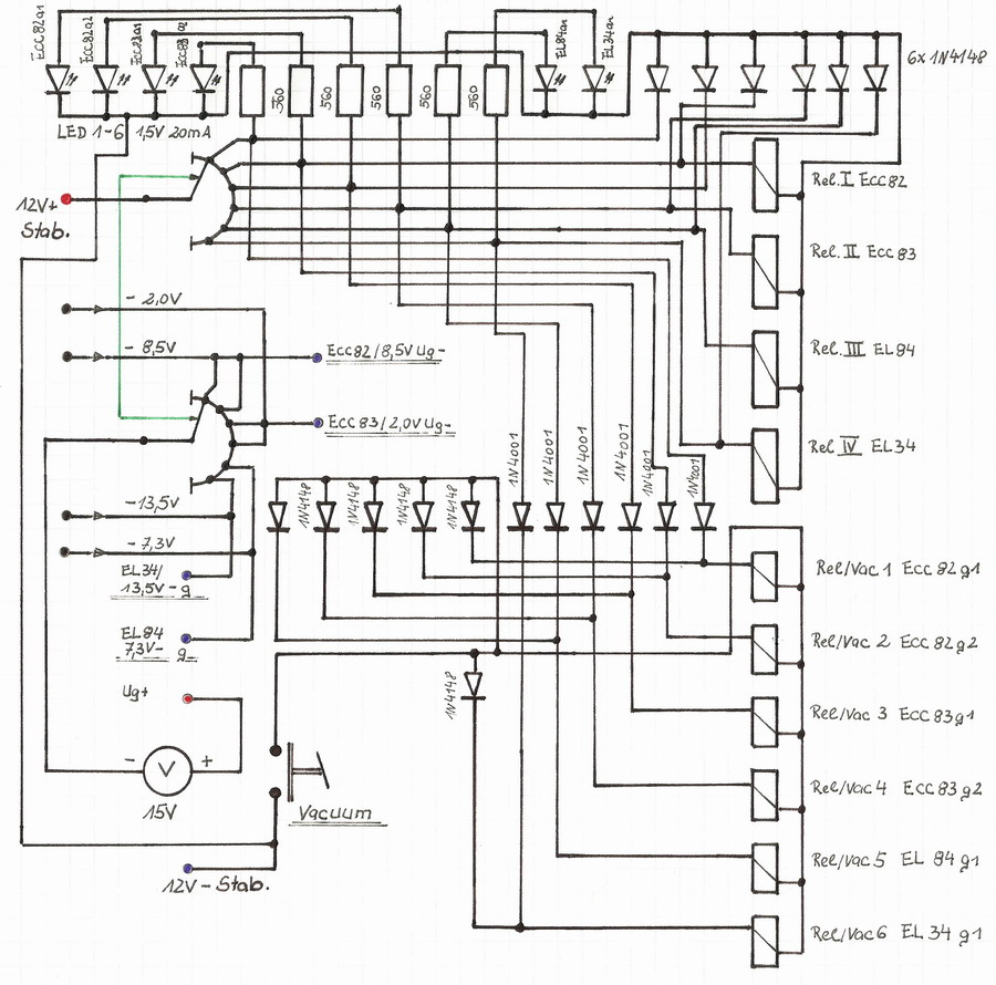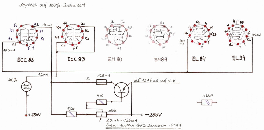 Die Funktion meines Röhren-Prüfers ist einfach. Mit dem Drehschalter (System) wird das jeweilige System bzw. Röhre eingestellt. Die ECC82 und ECC38 verfügen über zwei Systeme, welche separat gemessen werden (a1-a2), das ist notwendig, weil beide Trioden sehr unterschiedlich ausfallen können. Die EM80 / EM84 bekommen lediglich ihre 250 Volt Leuchtschirm-Spannung, um direkt gemessen zu werden. Nach einstellen des System-Drehschalters, wird die Röhre entsprechend am bezeichnetem Sockel ein gestöpselt. Danach bekommt der Heizfaden eine Spannung von 3,15 Volt, dabei wird dieser schon vor geglüht. Durch betätigen des "Start-Schalters" schaltet ein Relais die Heizfadenspannung auf 6,3 Volt um. Danach wird das Röhren-System langsam hochfahren. Über Widerstände (Anoden-Last-Widerstände) fange ich den Spannungsabfall ab, und leite ihn über Vorwiderstände, und präzisen Spindeltrimmern zum 1mA Instrument. Ein einstellbarer Last-Regler (zum Abgleich) dient dazu, das 1mA (100% Skala) abzugleichen. Zum Beispiel die EL 84, an der Anode wird der Last-Regler angeschlossen. Dabei muss die EL84 gezogen sein! An der gezogenen Kurzschluss-Brücke wird ein mA Instrument angeschlossen, und ein exakter Strom von 48mA eingestellt. Danach wird der entsprechende Spindeltrimmer auf exakt auf 100% abgeglichen. Bei den anderen Röhren entsprechend genau so verfahren. Beim Abgleich vorher alle Spindeltrimmer, auf Mitten-Stellung bringen! Die Kalibrierung der gesamten Röhren, besser 3 mal durchführen. Weitere Funktionen zur Prüfung der Röhren-Systeme sind: Vakuum, Systemschluss und Steilheit. Beim Prüfen des Systemschluss, muss darauf geachtet werden, dass eine Masse (-250 Volt) dauerhaft am Sockel ff-Heizung angeschlossen ist. Beim öffnen der Kathoden gegen Masse, muss das mA-Instrument schlagartig abfallen. Sollte das nicht so sein, dann liegt ein Kurzschluss im System der Röhre vor (zb. Kathode-Heizung) Die Anoden der ECC83 werden direkt über das 1mA Instrument geleitet (Anoden-Strom 1,2mA) Beim Betrieb dieser Schaltung, darf immer nur eine Röhre im entsprechenden Sockel stecken! Wenn das alles beachtet wird, funktioniert dieser Aufbau einwandfrei.