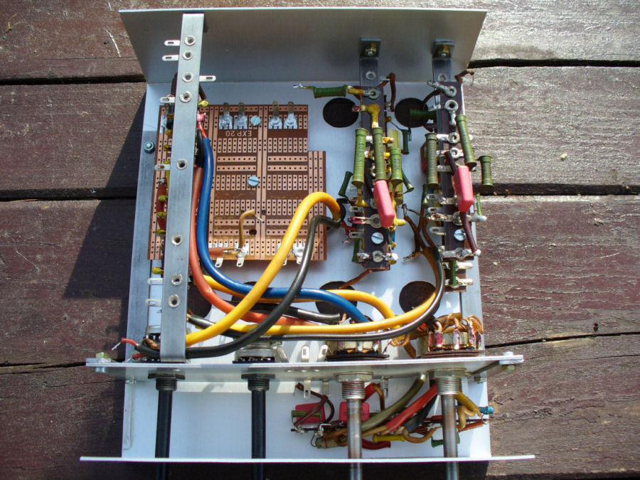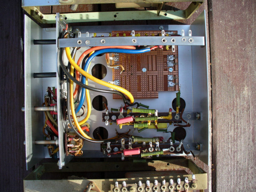 Die Klangregelung habe ich im Mittelteil selbst gebaut, bzw das Chasis. Alle noch funktionierenden und messtechnisch in Ordnung befindlichen Bauteile habe ich übernommen. Alle alten und ausgeglühten Röhrenfassungen , wie die Endstufen und Anoden Gleichrichterröhren, habe ich durch Porzelanfassungen neu ersetzt. Alle Bauteile aus der Vorstufe wie Klangreglung, habe ich wiederverwendet.