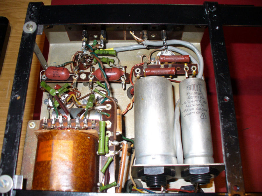 Koppelkondensatoren sind durch neues Materieal ersetzt worden. Wollte soweit es möglich war, die Originalität dieses alten Gerätes erhalten. Die Röhrenfassung der EC 92 behiehlt ihr Kunststoffsockel, da diese keine grosse thermische Belastung erfahren hatte im Laufe der Jahrzehnte.